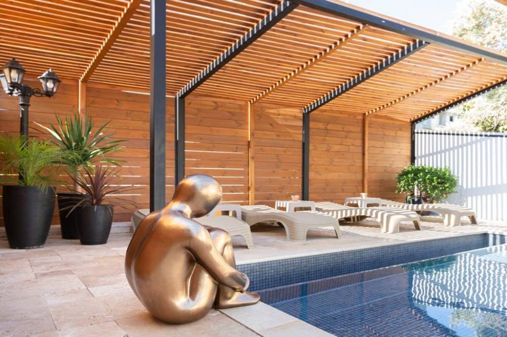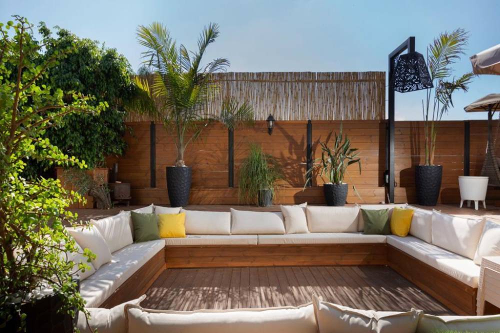 חצר המתחם רוויה בעצי נוי וצמחייה מכל עבר