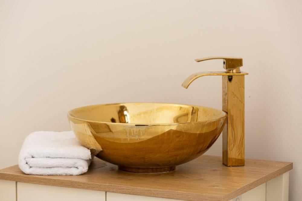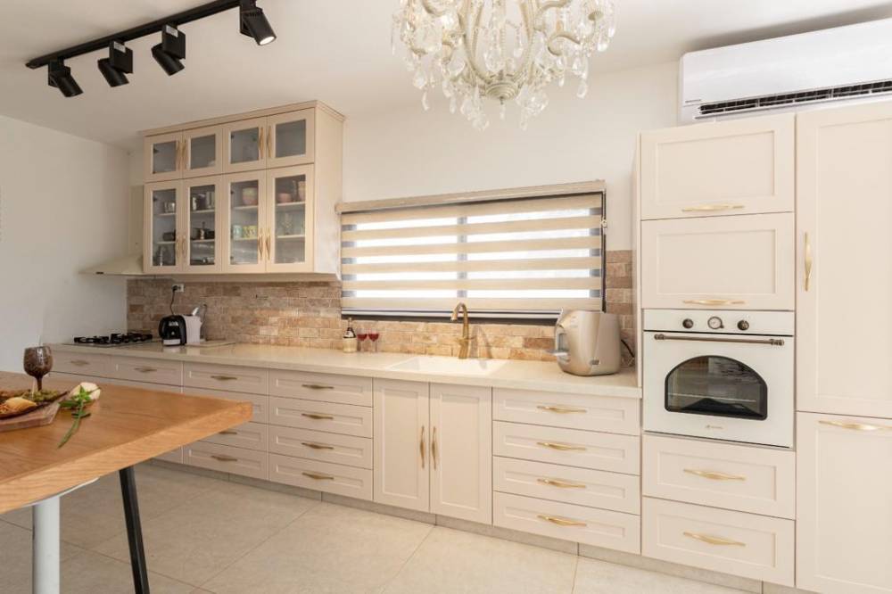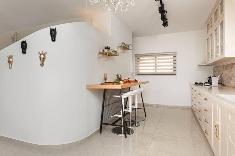 מטבח מעוצב הכולל: מקרר, מיקרוגל תנור, טוסטר, כיריים גז, כלי אוכל והגשה, תמי, מכונת אספרסו