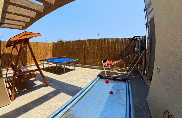 מרפסת הכוללת שולחנות משחק: פינג פונג, הוקי אוויר, מתקן כדורסל, נדנדה