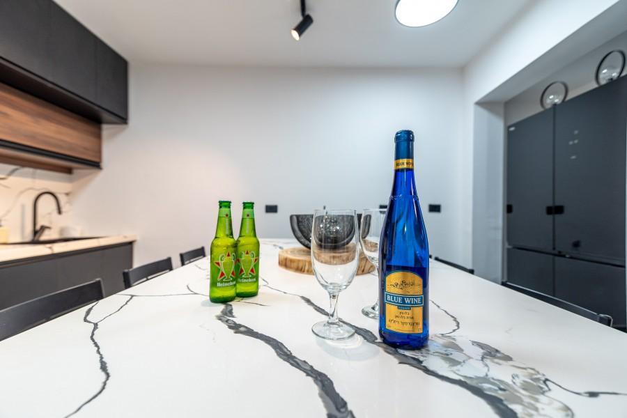 מטבח מאובזר הכולל: מכונת אספרסו, מקרר גדול, תנור אפייה, מיקרוגל, קומקום חשמלי, כיריים, כלי אוכל והגשה.