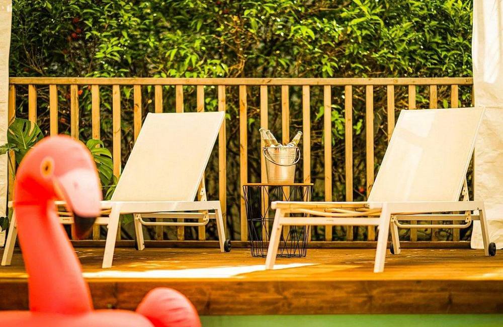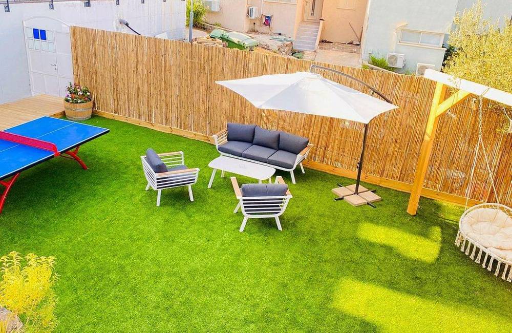 חצר רחבת ידיים עם ערסלים ופינות ישיבה