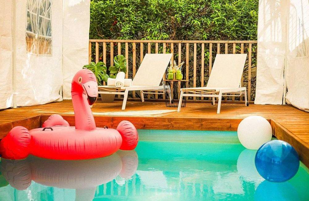 בריכת אינטקס גדולה ושקועה באדמה, הבריכה מקורה ומחוממת בחורף
