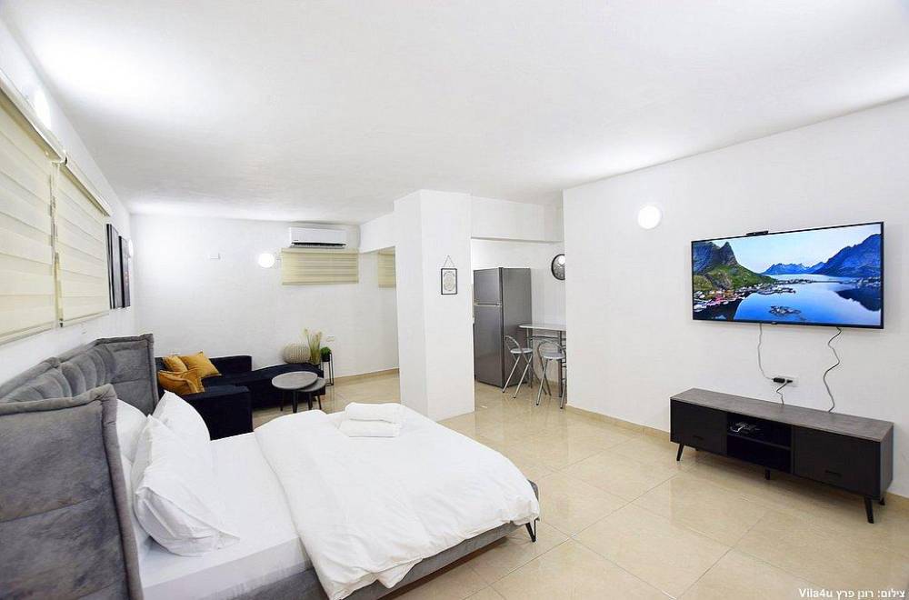 מיטה זוגית, טלוויזיה עם חיבור לכבלים, סלון עם ספה נפתחת, מטבח, חדר רחצה עם עם מקלחת ושירותים, מיזוג אוויר ושידות לאחסון