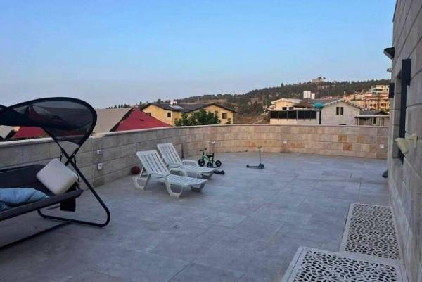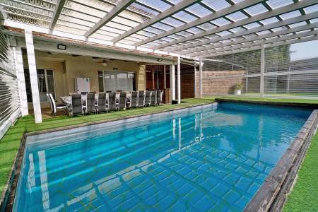 חצר גדולה עם מתחם דק ובריכת שחייה